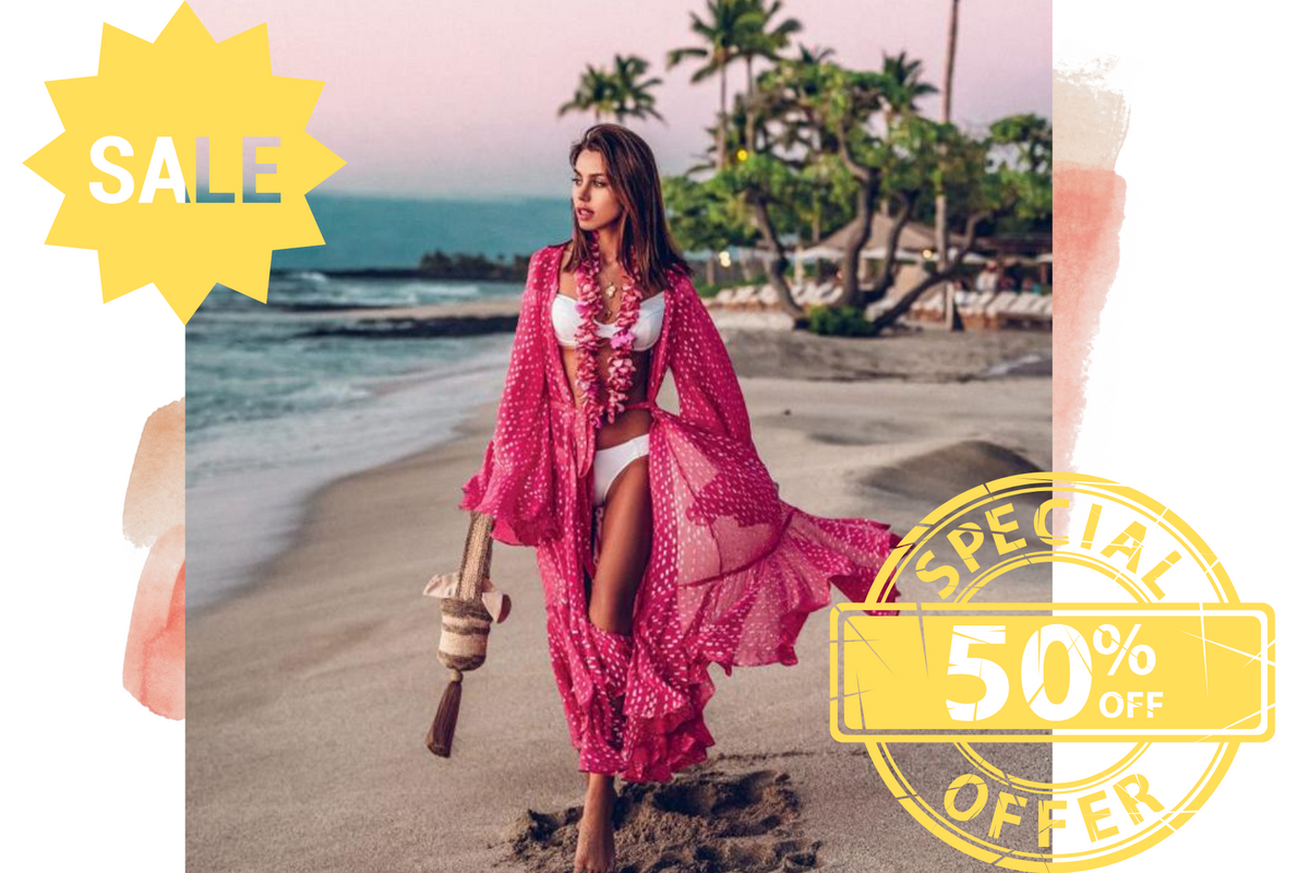 Inspired by the glamorous ladies of Dubai, this sheer, lightweight robe with trim detail is the ultimate beach cover up. It's also versatile enough to wear as an outer-layer for pure elegance and style. We love it in every colour!